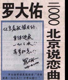 从《恋曲1980》到《恋曲1990》再到《恋曲2000》,罗大佑的歌一直在传 唱。凡是有中国人的地方都可以听到那“乌溜溜的黑眼珠……”,但是罗大佑 一直不是媒体上频频曝光的公众人物。 他的神秘对于北京的歌迷来说也许更 甚。在人们知道他名字之后的十几年中,他只悄悄来过北京一次,作了《恋曲 2000》之后又悄悄地走了。这次他终于面对记者露出了真面目:在他下榻的贵 宾楼饭店,罗大佑与记者单独聊起了他的创作、他的生活和他对自己音乐历程 的反思。